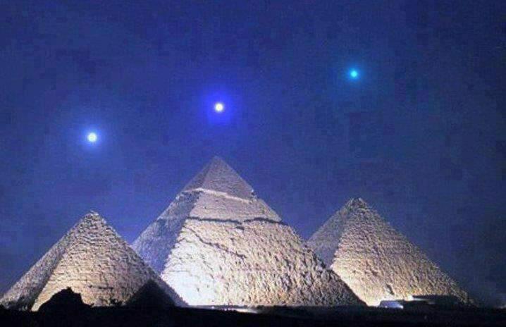 از راست به چپ عطارد، زهره و زحل به موازات اهرام مصر،این پدیده هر ۲۳۷۳ سال یک بار رخ می دهد.