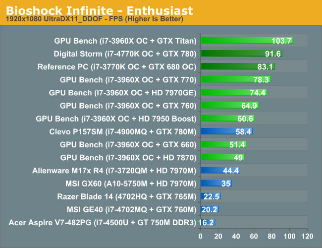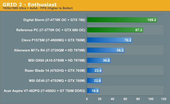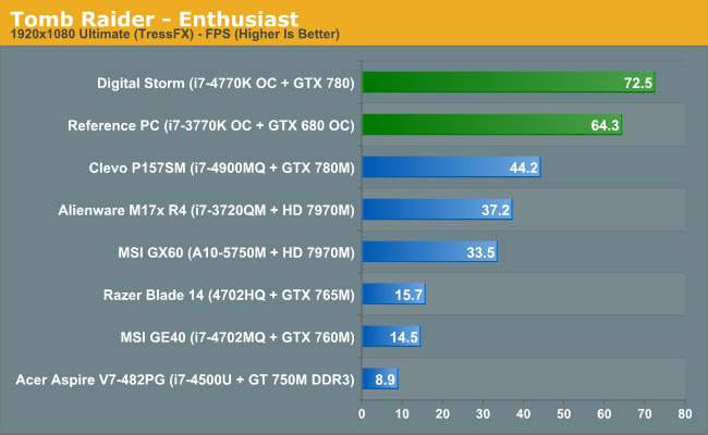 جالب اینجاست که GTX 750M که در دنیای لپتاپها بعد از GTX 765M و GTX 760M قرار دارد، عملکردی در حد 60 تا 80 درصد آنها را ارایه میکند. در حقیقت با این پردازندههای گرافیکی همراه نمیتوان بازیها را با تنظیمات بالا در رزولوشن فولاچدی اجرا کرد، باید جزئیات کمتر شده یا آنتی الیاسینگ به کلی غیرفعال شود.