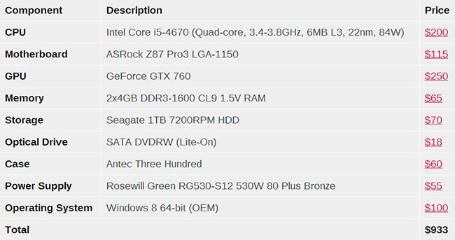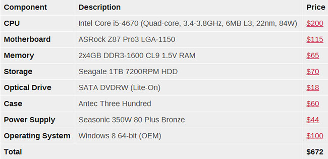 برای تهیهی یک سیستم مشابه اما به صورت دسکتاپ به جدول زیر توجه کنید و قیمتها را بررسی نمائید. در مجموع 672 دلار بودجه نیاز است: