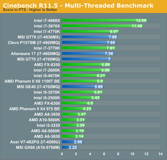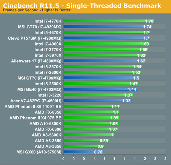 وقتی صحبت از کارایی پردازندهی اصلی در نرمافزارهای با تردهای پردازشی کمتر باشد، تفاوت بین دسکتاپ و لپتاپ چندان زیاد نیست. به عنوان مثال یک پردازندهی رده متوسط هسول برای لپتاپ یعنی i7-4700MQ تقریباً 85 درصد کارایی پردازندهی رده اول هسول دسکتاپ یعنی i7-4770K را دارد و جالبتر این است که i7-4930MX برای لپتاپ، حدود 98 درصد کارایی پردازندهی i7-4770K را در اختیار کاربر میگذارد. حتی i7-4500U که یک هسول کممصرف برای اولترابوکهاست هم قادر به تأمین 75 درصد کارایی i7-4770K میباشد.
